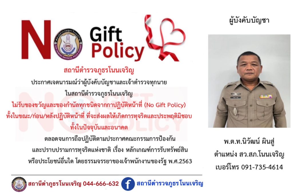 ประกาศเจตนารมณ์ที่จะไม่รับของขวัญและของกำนัลทุกชนิด จากการปฏิบัติหน้าที่ (No Gift Policy)
